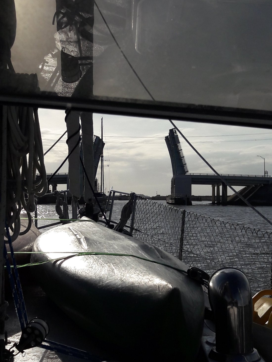 We were at sea for about 36 hours when we crept into Cape Canaveral. There was another channel, a lift bridge and a lock system. The lift bridge and lock being entirely new experiences. I think we managed like rockstars and were feeling pretty good until we saw where we were to dock. Docking a boat is likened to a controlled crash. Put the controlled crash between 2 pylons and a 10 foot long dock and things get tense. We knew it was coming and with the motor in neutral as soon as we nosed in, we used the gaffs, ropes and a very nice gentleman from another boat, we only knicked the bow a little.